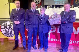 Mirko Biebaß, Verantwortlicher für die Feuerwehr in der Stadtverwaltung, dankte Monika Hübner, im Hintergrund v. l. Versammlungsleiter Kamerad Gunter Anton, Bürgermeister Peter Mühle und Gemeindewehrleiter Stefan Ullmann