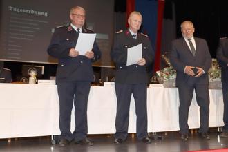 Auch die beiden Kameraden v. l. Frank Gerstenberg sowie Horst Gersch der Ortsfeuerwehr Neustadt wurden zum Ehrenmitglied ernannt, Bürgermeister Peter Mühle gratulierte ihnen