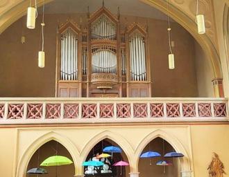 Schon im Eingangsbereich fallen hängende Regenschirme auf. Was könnte das bedeuten? Die Spannung steigt noch, als jemand mit einem Schirm zum Ambo tritt.