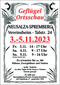 In schlechteren Zeiten sind einige Ausstellungen ausgefallen. In diesem Jahr findet die 110. Ortsgeflügelausstellung in Neusalza-Spremberg statt, sie steht damit in einer langen Tradition. In der Zählung sind zusätzliche Ausstellungen nicht berücksichtigt. In der Jahren 1992 bis 1995 führte der Verein die wieder ins Leben gerufene Oberlausitzschau durch. Drei dieser Schauen wurden in der alten Hünlichschen Fabrik abgehalten und sind dort zu einer beachtlichen Größe angewachsen. Zur Oberlausitzschau 1995 standen 2731 Tiere in den Käfigen, gezeigt von 328 Ausstellern aus ganz Ostsachsen. Es war die größte, die der Verein hatte. Leider wurde die alte Fabrik nach der Ausstellung abgerissen. Es folgten zwei Ausstellungen im Ratskellersaal. Der Wunsch nach einem Vereinsheim ging 1997 in Erfüllung. Die alte Schulspeisung (alte Knopffabrik Ulbrich) Talstraße 24, sollte das Vereinshaus werden. Das im Eigentum der Stadt bereits für den Abriss vorgesehen Objekt war natürlich baufällig geworden. Nach einigen Baumaßnahme konnte bereits 1997 die erste Ausstellung im Vereinshaus durchgeführt werden. Seitdem konnte jedes Jahr im November die Ortsschau an dieser Stelle stattfinden, außer 2020, die Corona bedingt ausfallen musste.