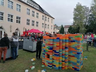 Doch ein Schulfest für Kinder sollte noch viel mehr bieten und so war es auch angekündigt. Neben den drei einzuweihenden Trampolinen gab es für Groß und Klein viel zu erleben und auszuprobieren: Da konnte sich jede und jeder an altbewährten Spielen testen, den Bewegungsdrang beim Springen auf den beiden Hüpfburgen ausleben, beim Kinderschminken in fremde Welten eintauchen und andere Rollen schlüpfen, mit großen LEGO-Bausteinen die ersten Träume vom eigenen Haus verwirklichen, unter professioneller Anleitung einen Bogen schießen, sich mit „Eule Trudi“ fotografieren lassen oder einfach nur schauen, staunen und quatschen.