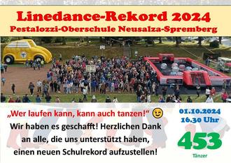 Wenig später wurden alle Anwesenden zum nächsten, dem heimlichen Höhepunkt des Festes aufgefordert - dem Versuch, unseren bestehenden Linedance-Rekord von 366 Tanzenden zu überbieten. Angestrebt waren 400 Mittanzende. Da es sich in der Region herumgesprochen hatte, dass wir einen solchen Versuch starten, kamen nicht nur Schülerinnen und Schüler unserer Schule mit ihren Familien. NEIN! Auch in den umliegenden Grundschulen und Kindertagesstätten wurde im Vorfeld fleißig geübt und das Tanzbein geschwungen. Sogar Linedance-Clubs aus der Umgebung durften wir begrüßen und auch die Presse kam. Den Beitrag können alle Interessierten auf YOUTUBE unter folgendem Link abrufen: https://youtu.be/eINBcacGawY?si=XKrcKOX3vPOve0zP
