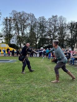 Doch damit war noch immer nicht Schluss. Zwei Asse hatten wir noch im Ärmel: Zunächst holte sich die Mannschaft aus Lehrkräften und Eltern den Sieg im Bubble-Fußball-Turnier und kurz vor Ende des Festes begeisterte ein spektakulärer Showkampf der Akteure des „Face to Face - Schaukampfteams Oberlausitz“ in mittelalterlichen Kostümen unsere Besucher.