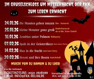Es ist wieder soweit: Der Friedersdorfer Karnevals Klub öffnet die Tore des Gruselschloss und lädt Jung und Alt zu einer schaurig-schönen Karnevalssaison ein! Unter dem Motto „Im Gruselschloss um Mitternacht, der FKK zum Leben erwacht“ erwarten euch in der 44. Saison sechs einzigartige Veranstaltungen.
