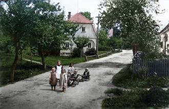 Dorfansicht 1932 bei Bäckerei Heidorn. Der Junge im Leiterwagen ist Gottfried Linke (19.11.1928 – 01.12.2017)
