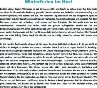 Endlich wieder Ferien. Wir haben so auf Schnee gehofft, um Rodeln zu gehen, leider hat Frau Holle uns einen Strich durch die Rechnung gemacht. Somit starteten wir die Ferien mit einem Ausflug zum Parkour-Spielplatz und tobten uns aus. Am nächsten Tag besuchten wir das Pflegeheim, spielten gemeinsam mit den Bewohnern verschiedene Tischspiele. Anschließend haben wir gekegelt. Auf dem Rückweg mussten wir unbedingt noch einmal auf den Spielplatz. Am Mittwoch kreierten wir verschiedene Badesalze und Seifen. Nach der ganzen aufregenden Woche tat uns ein Entspannungstag gut mit einer Igelballmassage und Traumreisen. Einfach herrlich. Am Freitag fand unser erster Kuchenbasar mit den Hortkindern statt. Vorher backten wir noch Kuchen. Der Verkauf war ein voller Erfolg. Vielen Dank an alle, die uns tatkräftig unterstützt haben. Wir waren sehr überwältigt.