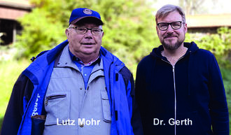 Diplom-Historiker Lutz Mohr (links), mit seinem Verleger, Dr. Andreas Gerth, im Herbst 2022 auf dem Verlagsgelände in Zittau-Dittelsdorf. Lutz Mohr veröffentlichte bei ihm u. a. das Kompendium „GESCHIICHTE - GESCHICKE - GESTALTEN“ und ist Verfasser zahlreicher heimatgeschichtlicher Beiträge im Oberlausitzer Familien-Kalenderbuch.