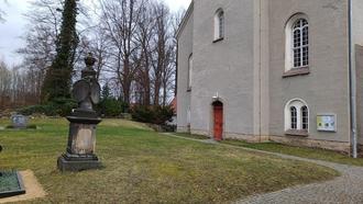Eine Schule und Kirche konnte der kleine Ort sich nicht leisten. Die Kinder liefen die weite Strecke zur Dürrhennersdorfer Schule. So beschreibt uns auch Oskar Schwär in der Chronik „Sonntags gingen die Neuschönberger denselben Weg zur Kirche nach Dürrhennersdorf. Manchmal zogen sie in schwarzer Tracht langsam hinter einen Sarg her. An einem der letzten Tage des Jahres 1820 trugen sie den Jäger i.R. Droßky, der im Oberhof wohnte, zu Grabe. Sein Denkmal, das eigenartigste des Kirchhofs, erzählt auf den zwei Schrifttafel, die an einem Säulenstumpf mit gekrönter Urne hängen.