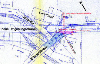 Situationszeichnung bei Künel (heute Fabian) – Einmündung Zittauer- und Talstraße.