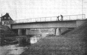 „Technisch sehr interessant ist der Brückenbau im Zuge dieser Umgehungsstraße. Die im Frühjahr ausgeführten Probebohrungen im Brückenbaugrunde ergaben äußerst ungünstige Bauverhältnisse. … Festgestellt wurde eine Schicht Schwemmsand und teilweise Lettenboden. Unter dieser Schicht kam man auf eine starke Wasserader, wahrscheinlich dieselbe, die weiter Spreeabwärts bei Töpfer Marschner beim Brunnenbau der Textil-AG C. C. Förster erbohrt worden ist und sich als außerordentlich ergiebig herausstellte. Wie stark die Wassermengen sind, zeigt die Tatsache, daß in der einen Baugrube zeitweise zwei Pumpen eingesetzt werden mußten, von denen jede stündlich 150000Liter Wasser leistet! Früh stand dann trotzdem jedesmal das Wasser in der Baugrube 20 Zentimeter höher als im Spreebett! Um eine feste Gründung der Brücke zu ermöglichen, mußten … eiserne Spundwände 3,80 bzw. 3.50 Meter tief eingerammt werden. Benutzt dazu wurde eine Ramme mit Benzolantrieb mit einem Rammgewicht von 20 Zentner. Insgesamt mußten über 200 Quadratmeter Spundwände eingetrieben werden. An einer Stelle war aber erst ein Findling von über 70 Zentner Gewicht zu entfernen. Die Baugruben hat man wegen der starken Wasserhaltung in je fünf Abschnitte, Lamellen genannt, getrennt, von denen jeder einzeln betoniert wurde. Benötigt werden insgesamt 250 Kubikmeter Eisenbeton für die Fahrbahn. Die Brücke wird 10,30 Meter breit, die Fahrbahn selbst 8 Meter. Zu beiden Seiten werden erhöhte Gehsteige angelegt.