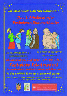 Sonnabend, den 3. Juni 2023, 19 Uhr laden „Die Mundartigen“ und der Friedersdorfer Karnevals-Klub (FKK) zum 2. Friedersdorfer Festwiesen-Sommertheater ein. Die Veranstaltung findet auf der Festwiese neben der Friedersdorfer Schule statt.