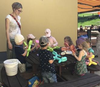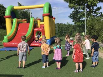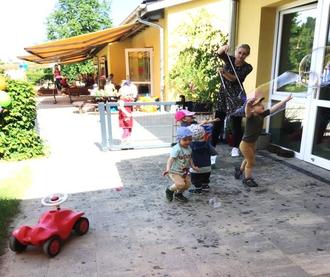 Am 01.06.2023 war es wieder so weit. Der diesjährige Kindertag stand auf dem Programm. Dank des schönen Wetters konnten alle geplanten Überraschungen im Freien stattfinden. Auf dem Sportplatz befand sich eine riesengroße Hüpfburg, wo sich zuerst die Krippenkinder und dann die Kita-Gruppen nacheinander ausprobieren und richtig austoben konnten. Außerdem hatten wir tatkräftige Unterstützung von fünf Eltern, die die Kinder geschminkt haben und Luftballontiere modellierten, welche unsere „Kleinen“ mit nach Hause nehmen durften. Ein herzliches Dankeschön an die fleißigen Helfer! Wer von den Krippenkindern mochte, konnte sich auch ein Glitzer-Tattoo machen lassen. Des Weiteren wurde das Klettergerüst, was die Krippe vom Weihnachtsmann geschenkt bekommen hat, für die „Freiluftsaison“ aufgestellt. Und es wurde gleich gut genutzt. Zwischendurch gab es für alle Melone, Eistee und Knabbergebäck für den kleinen Hunger. Natürlich durften an diesem besonderen Tag auch eine Kinderdisco und unsere Riesenseifenblasen nicht fehlen. Es war ein rundum gelungener Tag mit vielen Highlights, die die Kinderherzen höher schlagen ließen.
