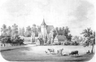 Dieser alte Druck zeigt uns noch die alte Kirche, bevor sie 1873 abgerissen wurde. Ganz rechts am Rande erkennt man noch die „Alte Schule“