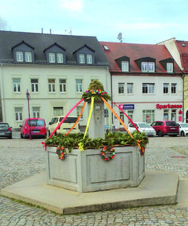 Im Zuge der umfangreichen Erneuerung und grundhaften Sanierung des innerstädtischen Bereiches bei Medien und Straßen, wird die Aufrichtung eines Brunnens am Obermarkt beschlossen. Dieser sechseckig gefasste Brunnen aus Granit ist nicht an das öffentliche Wassernetz angeschlossen sondern wird durch extra Befüllung und Umlaufpumpe betrieben.