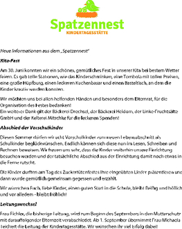 Frau Eichler, die bisherige Leitung, wird zum Beginn des Septembers in den Mutterschutz mit darauffolgender Elternzeit verabschiedet. Ab 1. September übernimmt Frau Michaela Teichert die Leitung der Kindertagesstätte. Wir wünschen ihr viel Erfolg dabei!