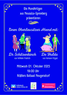 • Am Mittwoch, den 1. Oktober 2025, gibt unsere Theatergruppe „Die MundArtigen“ um 19 Uhr in Rößlers Ballsaal in Neugersdorf ein Gastspiel. Aufgeführt werden die Stücke „Dr Schitznkiench“ von Wilhelm Friedrich und „De Hulda“ von Herrmann Klippel.