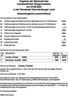 Das Ergebnis wurde in der Sitzung des Gemeindewahlausschusses am 25.09.2023 in Rudolf-Breitscheid-Str. 32e, OT Osternienburg, 06386 Osternienburger Land festgestellt.