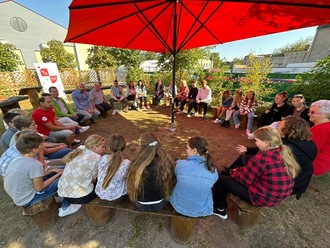 Am Vormittag fand die offizielle Einweihung des neuen orangefarbenen Sonnendaches im „Grünen Klassenzimmer“ statt.