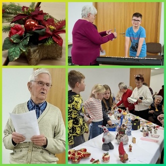 Im Vorraum des DGZ präsentierte der Hort auf einer langen Tischreihe selbstgebastelte Geschenke für Weihnachten. Es war erstaunlich, was man da alles erwerben konnte. Der Ideenreichtum war enorm. Dafür besserte man gerne die Hortkasse auf. Und Profi Manuel lud uns zum Raten von Liedern ein, die er kurz auf seinem Keyboard anspielte. Nicht immer gingen die Hände gleich nach oben, aber beim Anspielen des Flohwalzers schnellten alle Hände in die Höhe. Schön, Manuel!
