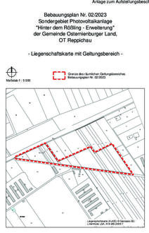 | Geltungsbereich des B-Planes: Der Geltungsbereich des Bebauungsplanes Nr. 02/2023 Sondergebiet Photovoltaikanlage „Hinter dem Rößling - Erweiterung“ der Gemeinde Osternienburger Land, Ortsteil Reppichau befindet sich | |