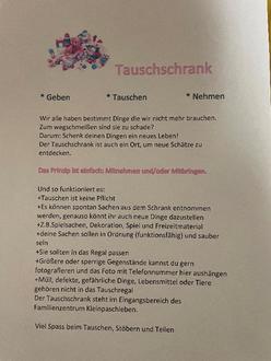 Seit kurzem gibt es im Familienzentrum einen Tauschschrank. Hier finden nicht benötigte Alltagsgegenstände eine weitere Verwendung. Jeder ist herzlich eingeladen, um unter anderen Spiele, Deko oder auch Bücher kostenlos zu tauschen, abzugeben oder einfach mit zunehmen. Durch die entstandene Idee von Frau Schwind und Frau Möbius konnte diese gemeinsam mit der Ortbürgermeisterin Frau Witzki ermöglicht werden.