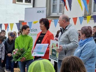 Übergabe des Schecks - mit K. Winkler (AOK), H. Ernst (Schulleiterin), H. Saage (AOK), M. Seidel (Landfrau) v. r. n. l.