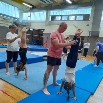 Statt einer Show in „Schwarz-Weiß“ wie im Januar erwartete uns dieses Mal eine ganz normale, harte Trainingseinheit. Nicht für uns. Unsere Augen und Ohren und Herzen wurden hier ganz schön durcheinandergewirbelt. Viele Augen sahen den kleinen und großen Profis zu! Aufregung machte sich doch etwas breit, will man doch immer sein Bestes zeigen. Nach dem Aufwärmen und dem Wuseln in allen Ecken verschwand die Anspannung und es ging zur Sache: Auf die Plätze – fertig – los! Flik-Flak, Überschlag, Handstand, Rolle vor- und rückwärts. Es machte den Turnern sichtlich Spaß, vor allem aber, dass sie ihr Können zeigen durften. Der riesige Beifall ist des Künstlers Lohn – das war hier gut zu hören! Übungen am Stufenbarren, Kasten und Schwebebalken ließen uns fast den Atem stocken. Wie gebannt fieberten wir den Sprüngen hinterher. Fabelhaft! Toll! Eine Spende von allen für alle und damit die Aussicht auf neue Turngeräte. Ein großes, echtes Sparschwein wechselte daher gut gefüllt die Besitzer. Wir kommen gerne wieder!