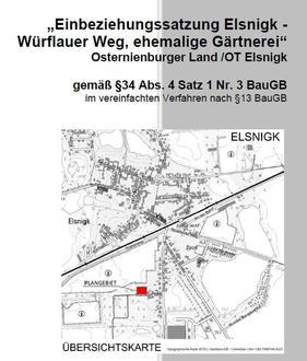 Der Gemeinderat Osternienburger Land hat auf seiner öffentlichen Sitzung am 19.06.2024 die „Einbeziehungssatzung Elsnigk – Würflauer Weg, ehemalige Gärtnerei“ im Ortsteil Elsnigk der Gemeinde Osternienburger Land, bestehend aus der Planzeichnung Teil A und den textlichen Festsetzungen Teil B gemäß § 10 Abs. 3 BauGB, als Satzung beschlossen. Die Begründung wurde gebilligt.