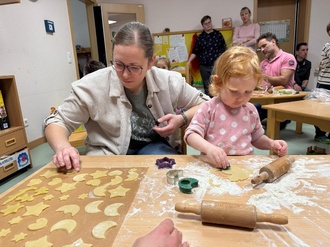 Mit Schürze, Teigrolle und jeder Menge Begeisterung wurden Sterne, Herzen und Tannenbäume ausgestochen. Anschließend durften die kleinen Bäckerinnen und Bäcker ihre Plätzchen bunt verzieren – mit Streuseln, Schokolade und Zuckerguss. Die Eltern hatten alle Zutaten selbst mitgebracht, sodass es an nichts fehlte.