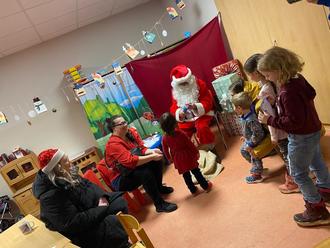 In den Gruppenräumen der "Marienkäfer" und "Frösche" wurde gebastelt, gemalt und geglitzert. Kinder fertigten kleine Geschenke, ließen sich Glitzer-Tattoos aufbringen und schrieben mit leuchtenden Augen noch letzte Wunschzettel an den Weihnachtsmann - der sie persönlich entgegennahm. Unvergessliche Familienfotos konnten vor der zauberhaften Kulisse aus Weihnachtsbaum, Holzschlitten und Leinwand gemacht werden - organisiert vom engagierten Elternrat.