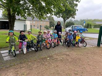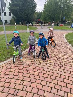 Um sicher im Straßenverkehr handeln zu können, gab es im Vorfeld eine kleine Einweisung. Bei dieser behandelten die Kinder Verkehrsschilder und Regeln, wie zum Beispiel das Verhalten am Zebrastreifen. Nach dem Aufsetzen des Fahrradhelms ging es endlich los. Voller Energie starteten alle und genossen sichtlich das tolle Erlebnis. Einige Kinder übten so fleißig, dass sie sogar den Sprung vom Laufrad auf das Fahrrad schafften. Einfach spitze!!!!!