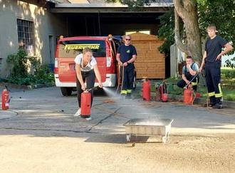 Um darauf eine Antwort zu finden, wandten wir uns an Herrn Sickert von der Zschaitzer Feuerwehr. Herr Sickert organisierte innerhalb kürzester Zeit eine Feuerlöscherübung für uns. Mit einigen Kameraden der Zschaitzer und der Döbelner Feuerwehr erklärte er uns, wie wir im Ernstfall handeln sollen. Das wurde auch praktisch erprobt.