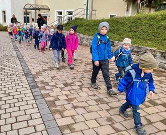 Die Kinder der Käfer-, Fuchs- und Schmetterlingsgruppe schnürten sich am 13. Oktober 2023 die Wanderstiefel und machten einen Ausflug durch Zschaitz. Um 9 Uhr starteten wir vom Kindergarten aus und machten uns auf den Weg Richtung Burgberg. Auf dem Weg dahin haben wir Schneebeeren (sogenannte Knallerbsen) entdeckt. Bei dieser Gelegenheit musste gleich ausprobiert werden, wie laut so eine Knallerbse machen kann. Am Burgberg angekommen konnten wir unsere Blicke über die Landschaft des Dorfes schweifen lassen. Den Kindern wurde nun das nächste Etappenziel der Wanderung verraten: der Zschaitzer Spielplatz. Mit viel Vorfreude machten sich die Kinder auf den Weg. Kaum waren wir am Spielplatz angekommen, sind einige zu den Spielgeräten gegangen und andere machten eine Pause, indem sie ihre selbst mitgebrachten Snacks auspackten. Nach langer Spielzeit machten wir uns über den Jahnatalradweg auf den Rückweg. Dabei sammelten wir Kastanien und Blätter auf, die wir für unsere Bastelarbeiten in den nächsten Wochen verwenden.