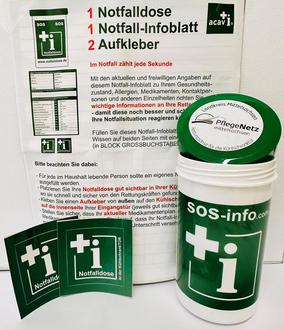 In Notsituationen benötigen Rettungskräfte schnell verfügbare Informationen über die betroffene Person. Dies kann lebenswichtig sein, stellt jedoch gerade bei nicht ansprechbaren oder alleinlebenden Menschen eine Herausforderung dar. Die Notfalldose ist hierbei eine gute Lösung: Das ausgefüllte Infoblatt in der Dose enthält wichtige gesundheitsbezogene Informationen zur Person. Durch die Aufbewahrung im Kühlschrank wissen Rettungskräfte in Notfallsituationen sofort, wo die Informationen verwahrt sind, so dass eine langwierige Suche entfällt.