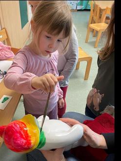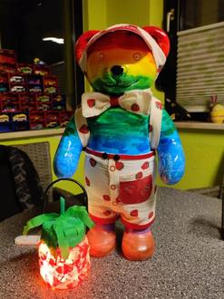 Mit Spannung wurde es gemeinsam geöffnet und zum Vorschein kam der kleine Erdbär von Karls Erlebnishof. Im Paket lag ein Brief mit der Bitte den Erdbär schön zu gestalten und ihn zurückzusenden, um an einem Kreativwettbewerb teilzunehmen. So gleich machten sich die Marienkäfer und die Frösche an die Arbeit und malten ihn an. Mit Unterstützung von Frau Hannelore Sklaretzki bekam unser Bär noch eine Mütze, eine Fliege, eine Hose und einen tollen Erdbeerrucksack. Zum Schluss wurde er noch mit einer selbstgebastelter Laterne ausgestattet, um jetzt am Wettbewerb teilzunehmen.