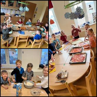 Ein weiterer Höhepunkt war das Pizzabacken in der Wackelzahngruppe – den Vorschülern. Wir kneteten den Pizzateig selbst, rollten ihn aus und bereiteten die Tomatensoße vor, die wir nach Lust und Laune würzten. Dann durfte jedes Kind beim Schneiden, Belegen und Auswählen der Zutaten mithelfen. Es wurden Salami, Schinken, Wiener, Röstzwiebeln, Sauce Hollandaise und viel Käse auf die Pizzen verteilt. Jedes Kind war stolz auf seine eigene, individuell belegte Pizza – ein köstlicher Genuss nach dem Backen!