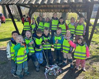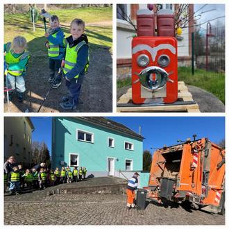 Doch damit nicht genug, ausgerüstet mit Greifzangen, Müllsäcken und Handschuhen zogen wir los um im Dorf und auf dem Spielplatz Müll zu sammeln. Dabei ist eine ganze Menge zusammengekommen und dann hatten wir richtig Glück, die Müllabfuhr kam. Wir konnten den fleißigen Männern bei ihrer Arbeit zusehen und hautnah erleben, wie der gesammelte Müll abgeholt wurde.