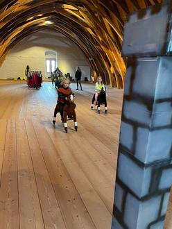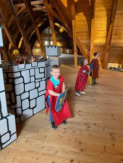 Am 16.05.2025 begannen unsere Vorschüler ihre Abschlussfahrt mit einem gemeinsamen Frühstück im Kindergarten „Jahnataler Wiesenstrolche“ in Ostrau. Nach reichlicher Stärkung für den spannenden Tag fuhren wir mit dem Zug und dem Bus Richtung Leisnig. Am Bahnhof angekommen nutzen alle erst einmal den neuerbauten Spielplatz zum Erkunden und Austoben. Anschließend kehrten wir in die „Mildensteiner Gaststube“ ein und stärkten uns bei Limonade und Nudeln mit Tomatensoße. Nun ging es zur Burg Mildenstein bei der wir unter Anleitung auf dem großen Dachboden Ritterspiele durchführten. Dabei mussten die Kinder ihre Königin und ihren König verteidigen, mit den Pferden um die Wette reiten und gemeinsam Burgen erbauen und verteidigen. Im Anschluss besichtigten wir noch die Burg und bestiegen den Bergfried, um die tolle Aussicht von oben über Leisnig, der wunderschönen Mulde und der frühlingshaften Umgebung zu betrachten.