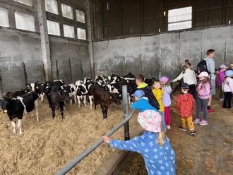 Mit dem Bus fuhren wir nach Leschen, wo uns schon viele spannende Eindrücke erwarteten. Zuerst besichtigten wir die großen Kuhställe. Die Kinder staunten nicht schlecht über die vielen Kühe und erfuhren, wie sie gehalten und versorgt werden. Besonders aufregend war der Besuch bei den Kälbchen. Die kleinen Tiere waren sehr schreckhaft, aber auch neugierig - ein echtes Highlight für die Kinder.