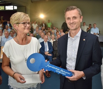 Für all das gab es während der Veranstaltung viel Applaus, der dann nochmal besonders laut wurde, als Bürgermeister Benjamin Kanngießer gemeinsam mit BEWOS-Geschäftsführer Prof. Dr. Thomas Harborth einen symbolischen Schlüssel an Cornelia Kurowski vom Kinder-, Jugend und Familienwerk der Volkssolidarität überreichte, von dem das neue Jugendzentrum betrieben wird.