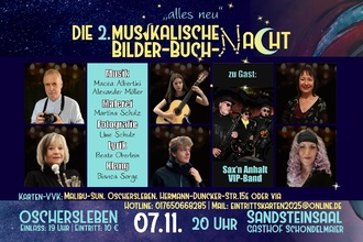 Nach der erfolgreichen Premiere im letzten Jahr geht die musikalische Bilder-Buch-Nacht in Oschersleben am 7. November 2025 in die zweite Runde. "Alles neu" - unter diesem Motto startet um 20:00 Uhr in stilvoller Kulisse des Sandsteinsaals des Gasthofs Schondelmaier die 2-stündige, abwechslungsreiche Veranstaltung der kreativen Oscherslebener und ihrer Gäste. Interessierte dürfen sich freuen auf Malereien von Martina Schulz, Klang von Bianca Sorge, Fotografien von Uwe Schulz und Lyrik von Beate Oberlein. Letztere ist die Initiatorin der Reihe und wird, so wie im letzten Jahr, die Veranstaltung erneut moderieren. Musikliebhaber kommen auch bei der Neuauflage der musikalischen Bilder-Buch-Nacht wieder voll auf ihre Kosten. Als Gäste haben die Veranstalter diesmal ein besonderes Schmankerl auserkoren. Die bekannte Sax'n Anhalt VIP Band aus der Landeshauptstadt gibt sich die Ehre. Zudem werden zwei junge Musiker an diesem Abend in Oschersleben eine Bühne bekommen. Es ist gelungen, die begabten Oscherslebener Musikschüler Macea Albertini (Gitarre) und Alexander Möller (Piano) zu engagieren, die sich mit jeweils zwei Stücken verschiedener Genres den Besuchern präsentieren werden. Alles in allem eine bunte Mischung, die eine unterhaltsame, kurzweilige Zeit verspricht.