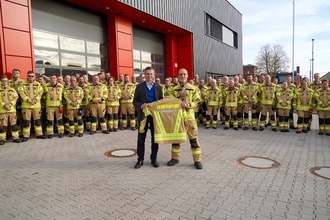 Bürgermeister Benjamin Kanngießer übergab die neue Einsatzbekleidung an die Einsatzkräfte. Stadtwehrleiter Carsten Loof bedankte sich stellvertretend für alle Kameradinnen und Kameraden: „Es ist nicht selbstverständlich, dass eine Verwaltung gleichzeitig für alle Ortsfeuerwehren eine so umfangreiche Investition tätigt.“