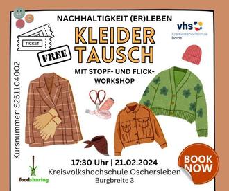 Frei nach dem Motto „Tauschen ist besser als Kaufen“ lädt die IG LebensMittelpunkt Oschersleben in Zusammenarbeit mit foodsharing.de gemeinsam mit der Volkshochschule zum Kleidertausch mit Flick- und Stopfworkshop ein. Beim Kleidertausch haben Sie die Möglichkeit, noch tragbare Kleider zu verschenken, anzuprobieren und mitzunehmen. Das ist umweltbewusst, sozial verantwortlich, kostengünstig und trotzdem modisch nach Ihrem Geschmack. Das