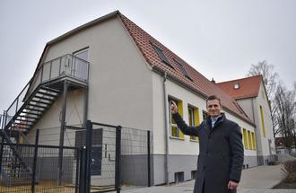 Oscherslebens Bürgermeister Benjamin Kanngießer vor der Diesterweg-Grundschule, die mit der energetischen Sanierung auch eine umweltfreundliche Heizung bekommen hat und auf deren Dach in diesem Jahr noch eine Photovoltaikanlage installiert wird.