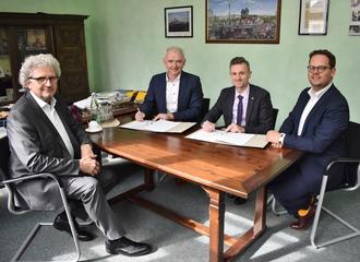 Dem Bau eines neuen Oscherslebener Feuerwehrgerätehauses steht nichts mehr im Wege. Nach mehr als sechsjähriger Vorarbeit hat Bürgermeister Benjamin Kanngießer nun mit der GOLDBECK Nordost GmbH den Bauerrichtungsvertrag des Projektes unterschrieben. Dazu ist der Baufirmen-Geschäftsführer Robert Wall (Foto 2. von links) gemeinsam mit seinem Magdeburger Niederlassungsleiter Sebastian Bethge (rechts) sowie mit Ulrich Kirchner (links) vom Magdeburger Architekturbüro Kirchner & Przyborowski in das Oscherslebener Rathaus gekommen.