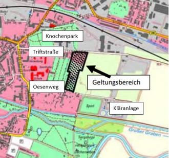 Der Geltungsbereich der 3. Änderung des Teil-Flächennutzungsplans befindet sich im Osten von Oschersleben. Er umfasst die Wohngrundstücke an der Triftstraße, ein Gewerbegrundstück am Oesenweg und zwischenliegende Brachflächen. Der Geltungsbereich hat eine Größe von ca. 1,8 Hektar.