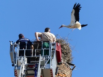 Anfang Juni unterstützte die Oscherslebener Feuerwehr mit dem Drehleiterfahrzeug die Storchenexperten Wolfgang Nikolaj und Thomas Suckow in der Hornhäuser Straße. Hier befindet sich seit vielen Jahren in rund 20 m Höhe ein Storchenhorst. Wie in jedem Jahr sollten Jungstörche beringt werden. Da nicht klar, war ob sich in diesem Jahr überhaupt Nachwuchs im Nest befand, kam die Drehleiter der Feuerwehr zum Einsatz. Der Korb der Drehleiter wurde vorsichtig in die Höhe gefahren. Feuerwehrmann Frank Haumrich und Thomas Suckow konnten dann einen Jungstorch im Nest finden. Das circa 4 Wochen alte Tier wurde vorsichtig in den Drehleiterkorb gehoben und nach unten gebracht. In wenigen Minuten wurde das Tier beringt und registriert. Durch die Beringung ist es möglich, Störche in ihren Brutgebieten und auf den Zugwegen zu identifizieren und so ihren Lebenslauf zu erforschen und zu verbessern. Im Anschluss wurde das Tier wieder hoch in das Nest gebracht. Die ehrenamtlichen Storchenexperten berichteten, dass es in diesem Jahr leider nur sehr wenig Nachwuchs in den rund 15 Storchenhorste gibt, welche sie betreuen. Dieses hat verschiedene Ursachen. Das größte Problem ist wohl die Trockenheit, welche eine Nahrungssuche sehr schwierig macht. Hoffen wir alle, dass es im nächsten Jahr wieder mehr Nachwuchs in den Storchennestern geben wird.