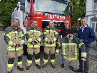 Kürzlich übergab Bürgermeister Benjamin Kanngießer, stellvertretend für alle Ortsfeuerwehren, die Einsatzbekleidung in Oschersleben an Stadtwehrleiter Carsten Loof.