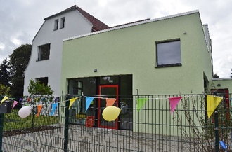 Unter anderem ist das Kita-Gebäude, das Anfang des 20. Jahrhunderts als Villa Dopp gebaut wurde, im Zuge dieser jetzigen Arbeiten mit einem Anbau erweitert, mit einem Aufzug ausgestattet und mit vielen weiteren Veränderungen in eine ganz moderne barrierefreie Kita umgestaltet worden. In der nun die Möglichkeit besteht, 38 Mädchen und Jungen im Krippen- und Kita-Alter unter optimalen Bedingungen zu betreuen.