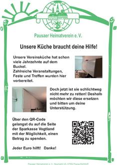 Der Pausaer Heimatverein - gegründet 1994 - nutzt seit 1998 eines der ältesten Gebäude Pausas. In einem der verwinkelten Zimmer des Hauses am Neumarkt 3a wurden gebrauchte Küchenmöbel aus DDR-Zeiten eingebaut, die ein Vereinsmitglied spendete. Diese Ansammlung von Küchenmöbeln entspricht nunmehr weder den technischen noch den hygienischen Standards. Ein alter Kühlschrank ist das einzige für Veranstaltungen zur Verfügung stehende elektrische Gerät. Die Küche ist mehrere Jahrzehnte alt und diente bisher der Vorbereitung von Feierlichkeiten, Vereinstreffen, regionalen Festen sowie zur gastronomischen Versorgung von Vorträgen und Konzerten. Auch die verschiedenen Interessengruppen des Vereins sind auf die Küche angewiesen.
